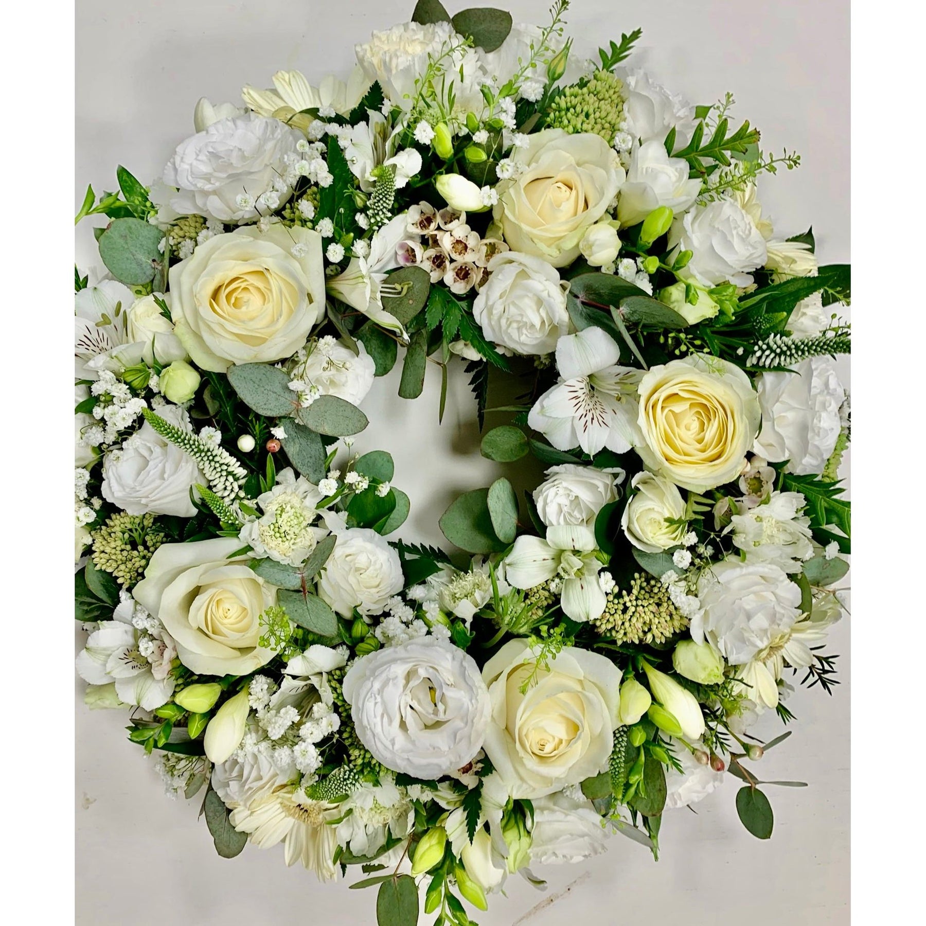 Our open loose funeral wreaths are delicately beautiful. Featuring seasonal blooms matched with fresh foliage.